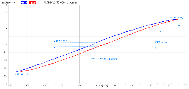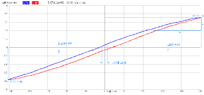 以上是某RV減速器在180N.m和200N.m加載的剛度測試,可以看出,齒隙、空程基本不變,兩次測量齒隙的差值是0.002min。剛度測試值,分別是56.1、55.9,有差異,這是因為兩次加載的最大轉(zhuǎn)矩不同,分別為202N.m和182N.m,同時這一結(jié)果也說明了:隨著轉(zhuǎn)矩的增大,剛度值在增大,驗證了剛度值隨轉(zhuǎn)矩的變化趨勢。
